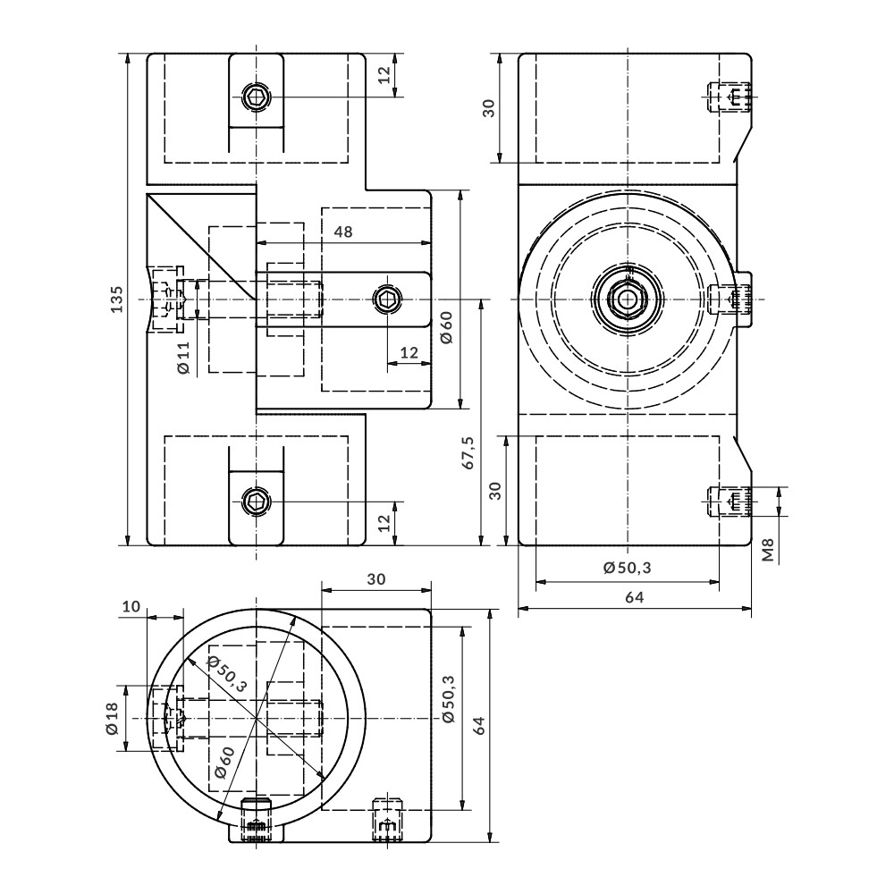 União para conectar três tubos terminais a 90º entre dois deles e em Cantoneira variável com o outro. São fixados através da pressão exercida por parafusos prisioneiros. Não requer usinagem dos tubos.