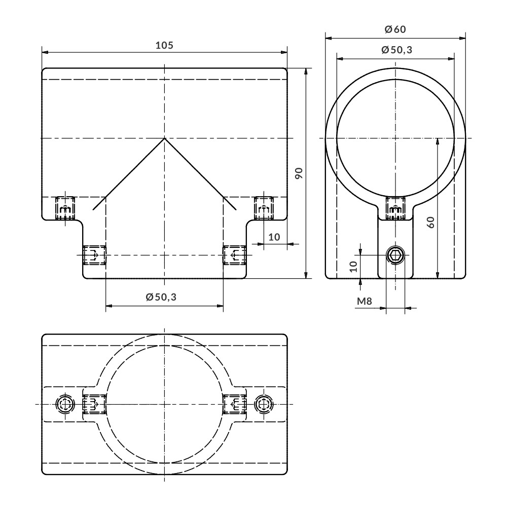 União para conectar um tubo passante a outro terminal a 90º. São fixados através da pressão exercida por parafusos prisioneiros. Não requer usinagem dos tubos.