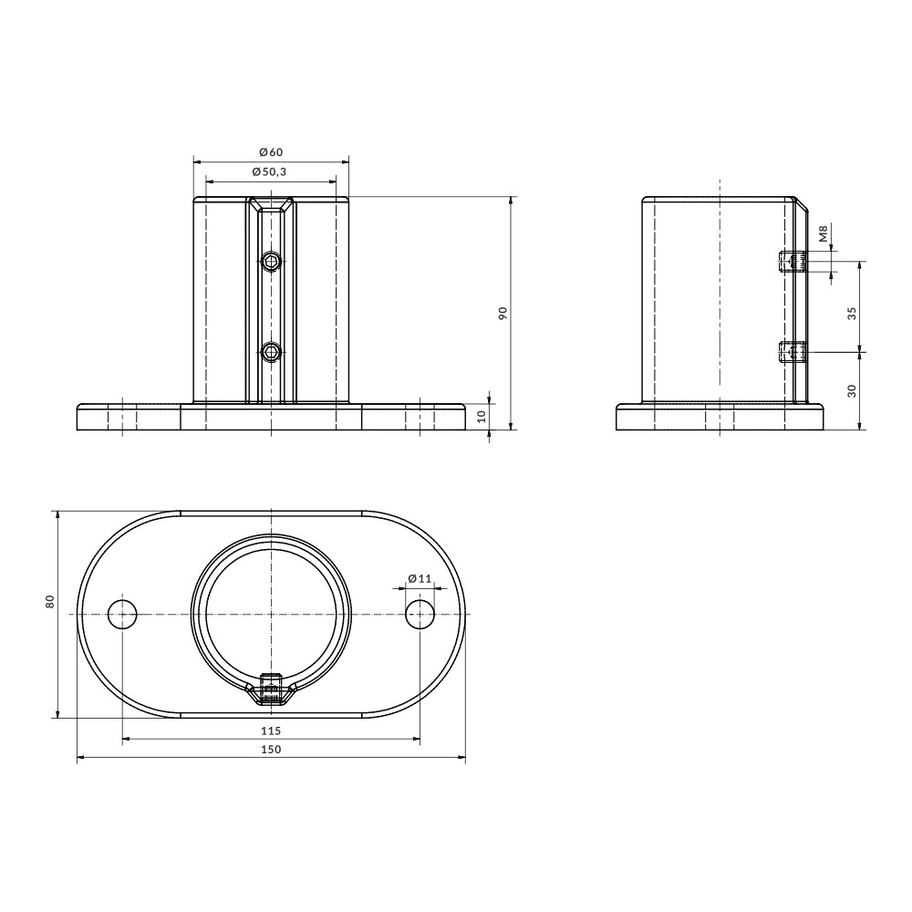 Base de fixação para fixação do tubo à superfície, com 2 pontos de fixação. O tubo é fixado através da pressão exercida pelos parafusos prisioneiros. Não requer usinagem dos tubos.