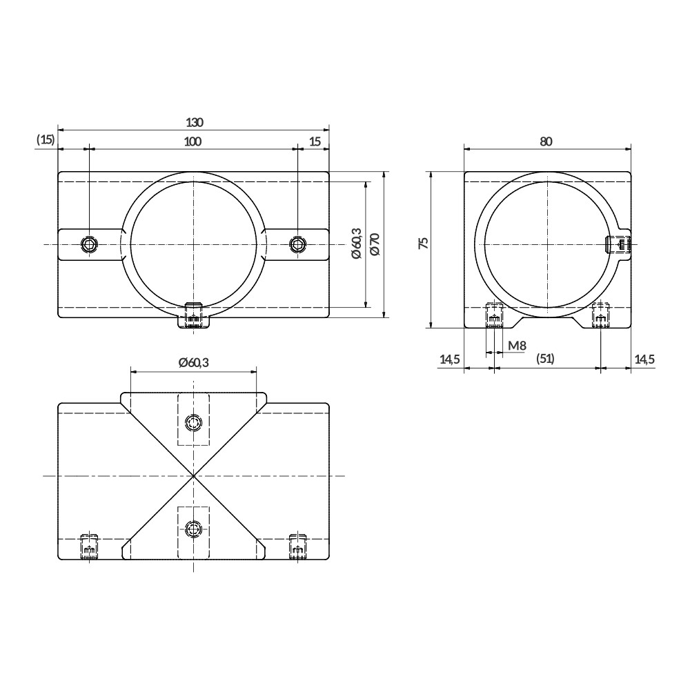 União para conectar um tubo passante a outros dois tubos terminais a 90º. São fixados através da pressão exercida por parafusos prisioneiros. Não requer usinagem dos tubos.
