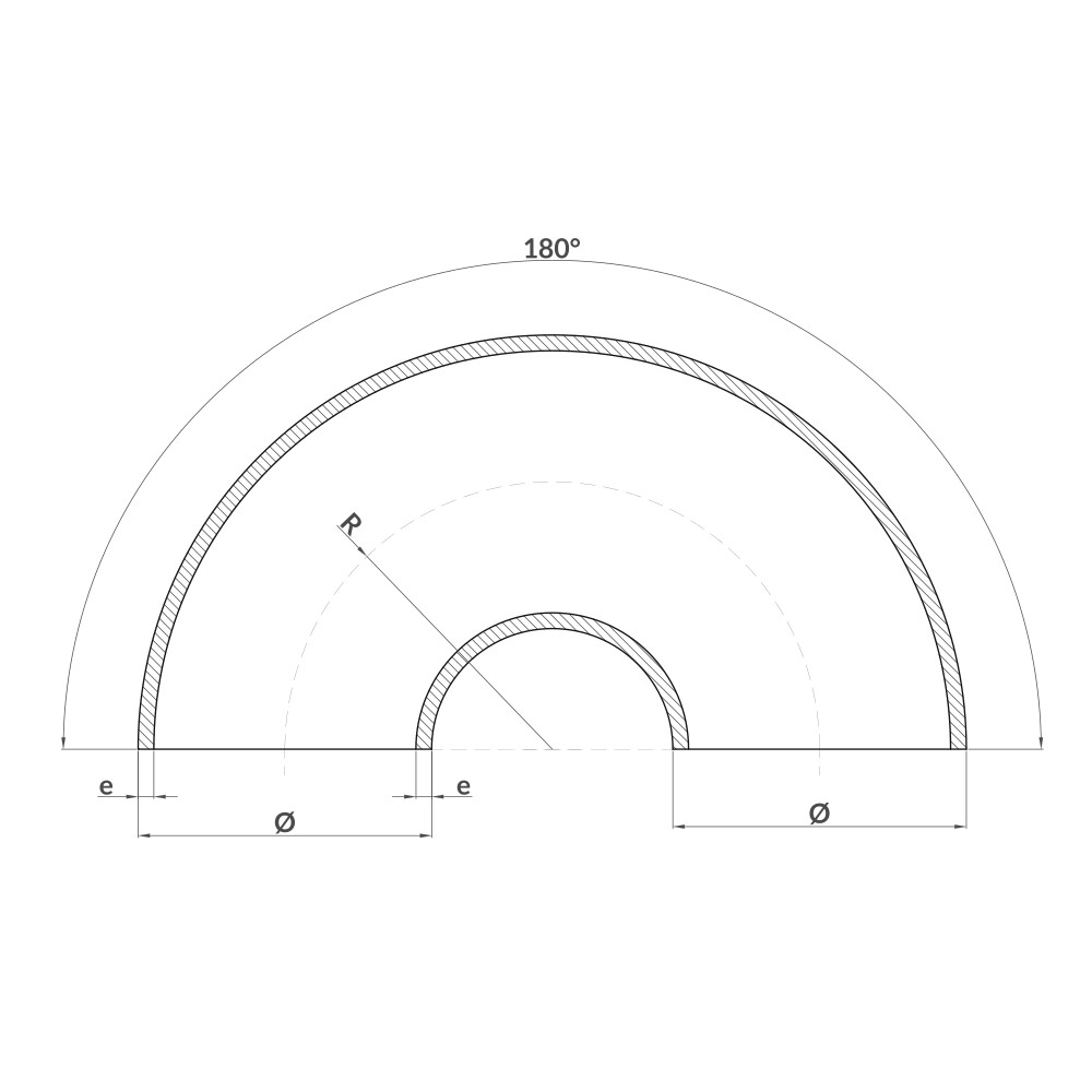 Cotovelo de alumínio a 180º fabricado en la aleación 1050 O, sem soldadura, de acordo com a norma EN 754/755 e com design semelhante ao da norma DIN 2605. São adequados para utilização em instalações de condutas e veículos-cisterna.